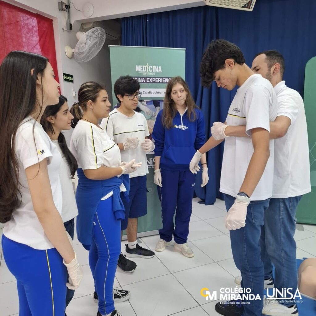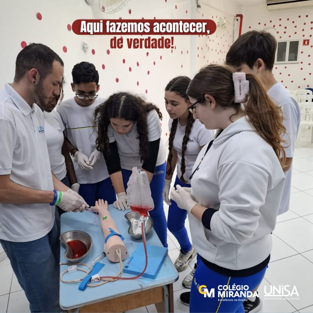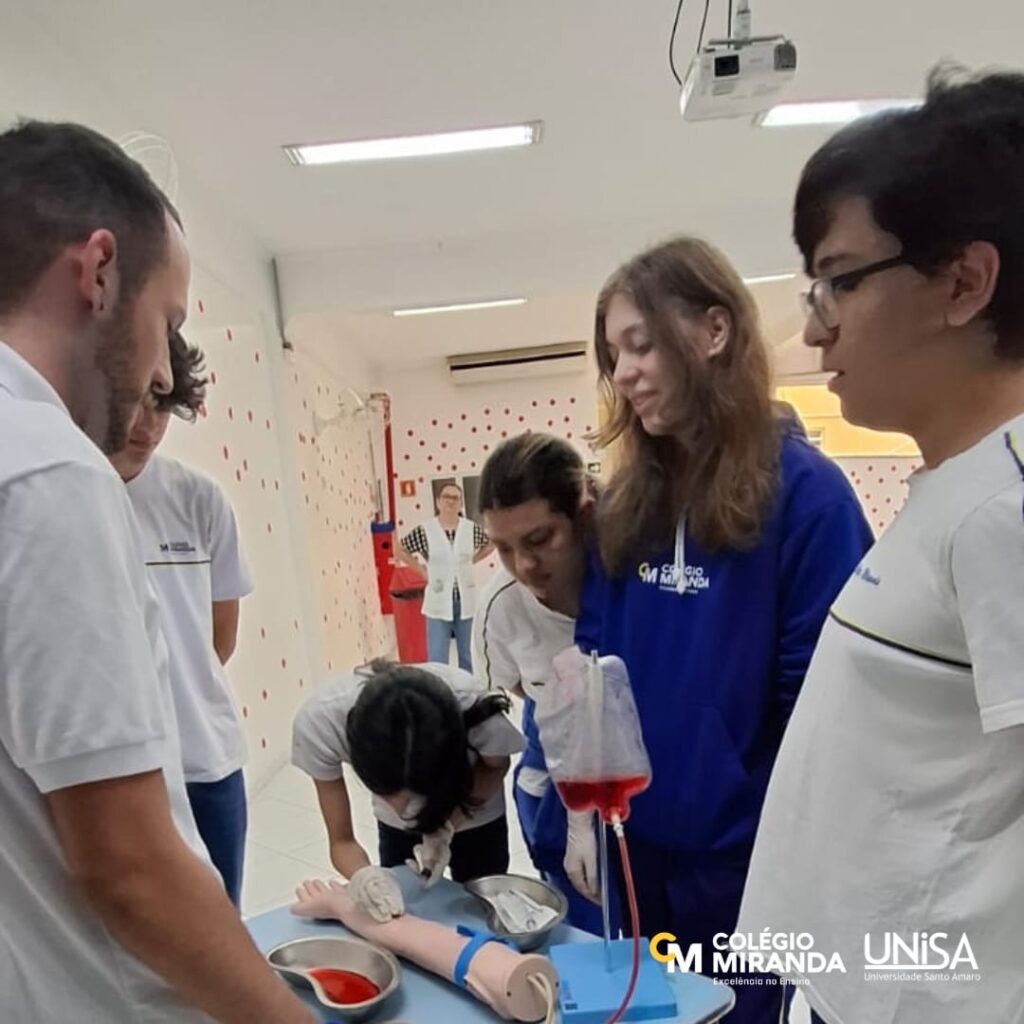 Nossos alunos do Ensino Médio vivenciam experiências reais que os aproximam da carreira dos sonhos. Em parceria com a Universidade Santo Amaro – UNISA, oferecemos práticas na área da saúde, como manobras de primeiros socorros, aplicação de injeções e simulações clínicas completas.